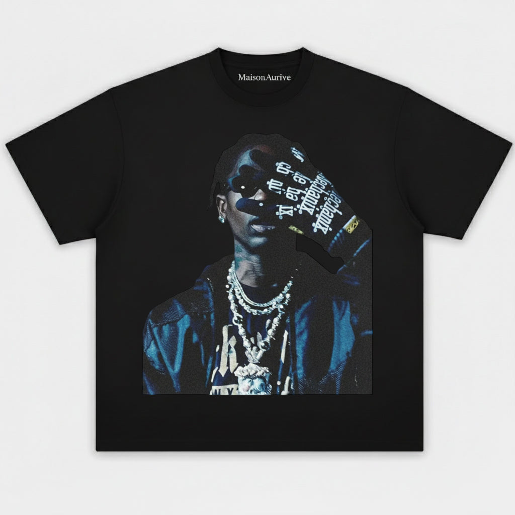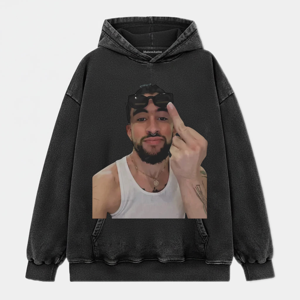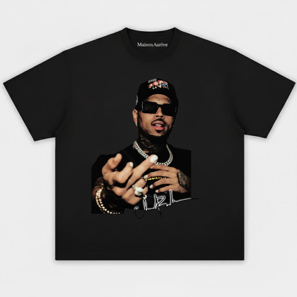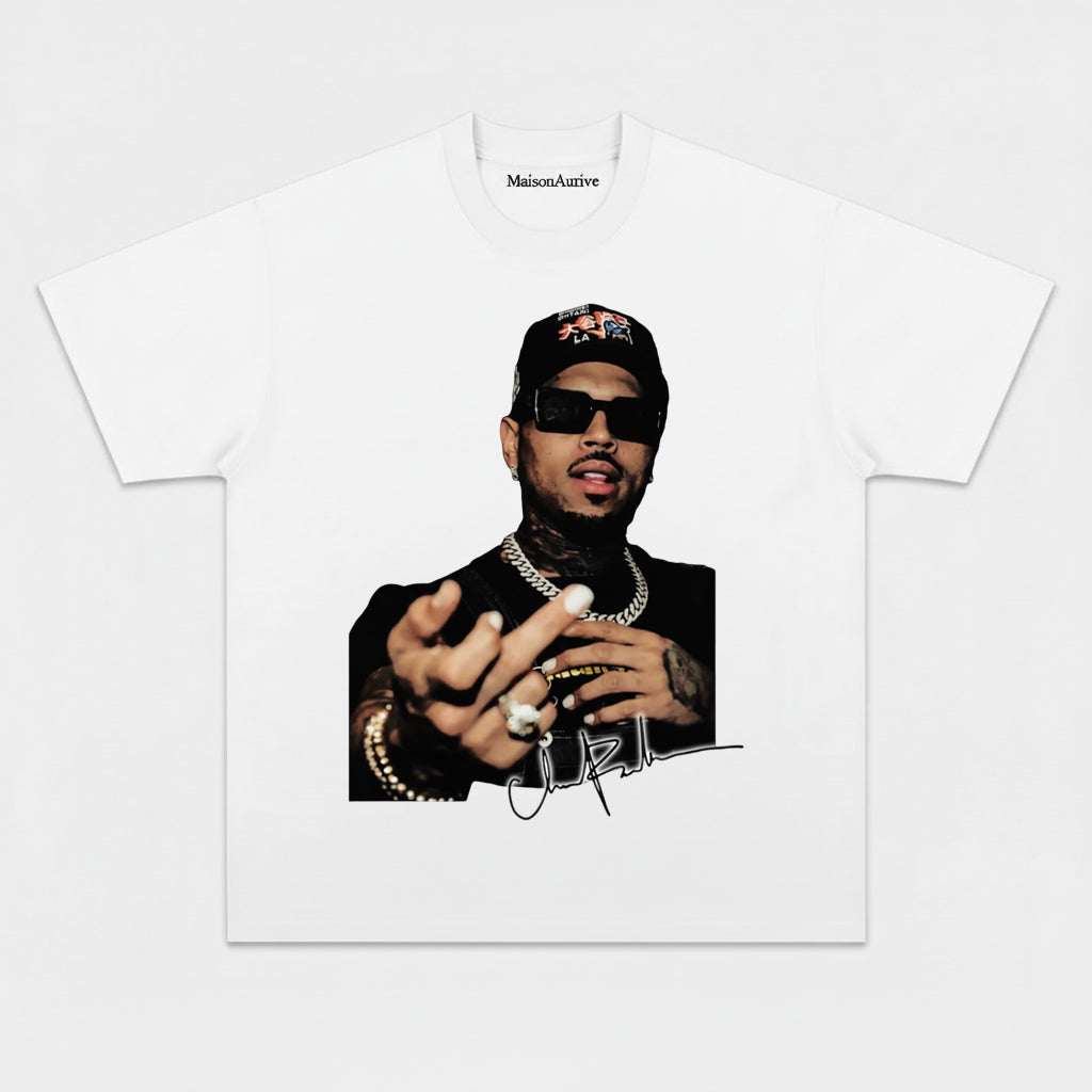 MaisonAurive Washed Hip-Hop Tee – Slogan Gesture & Chain Portrait Waterwashed Charcoal