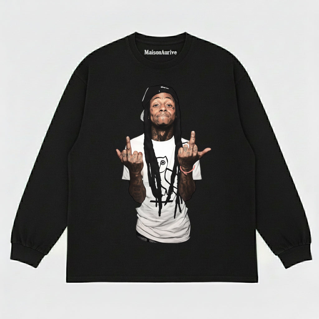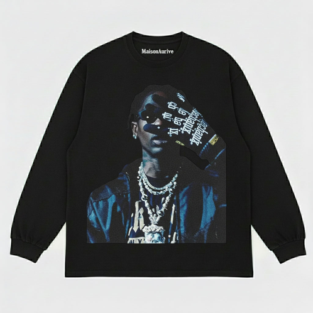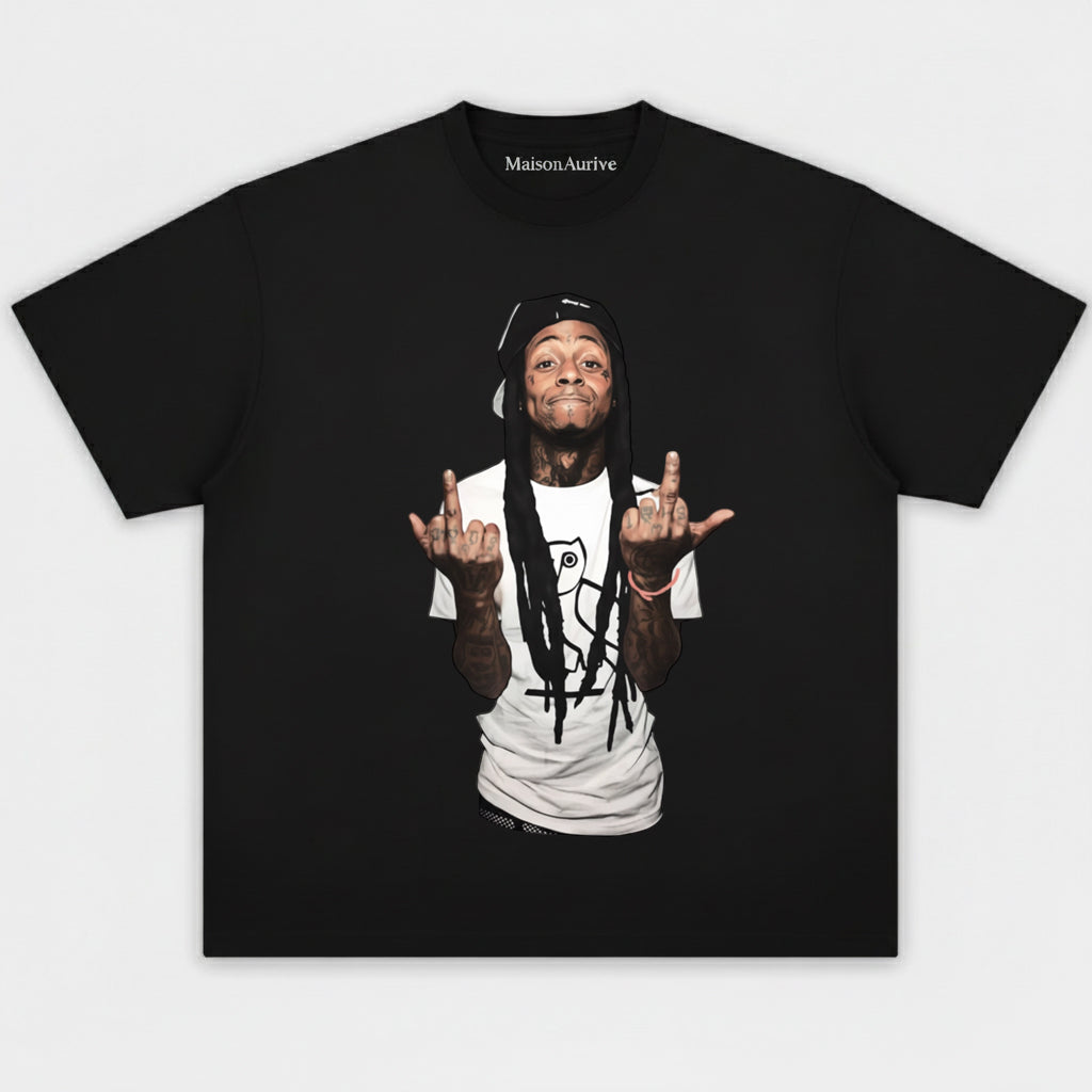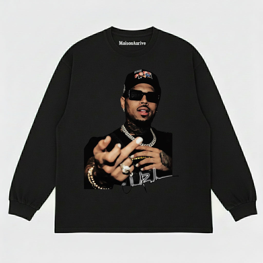 MaisonAurive Washed Hip-Hop Tee – Slogan Gesture & Chain Portrait Waterwashed Charcoal