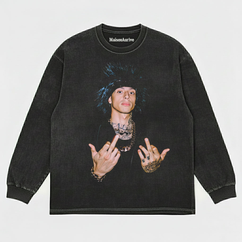 MaisonAurive Washed Hip-Hop Tee – Punk Hair Tattoo Gesture Portrait Waterwashed Charcoal