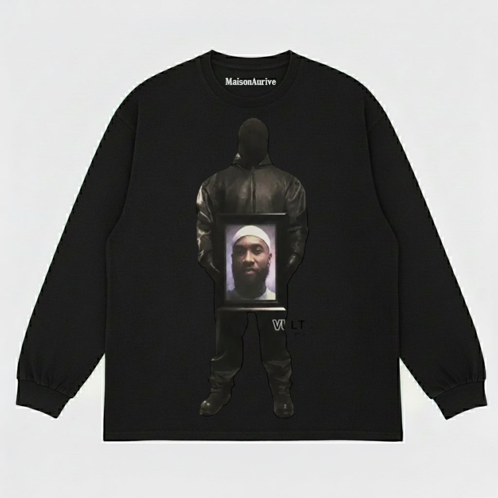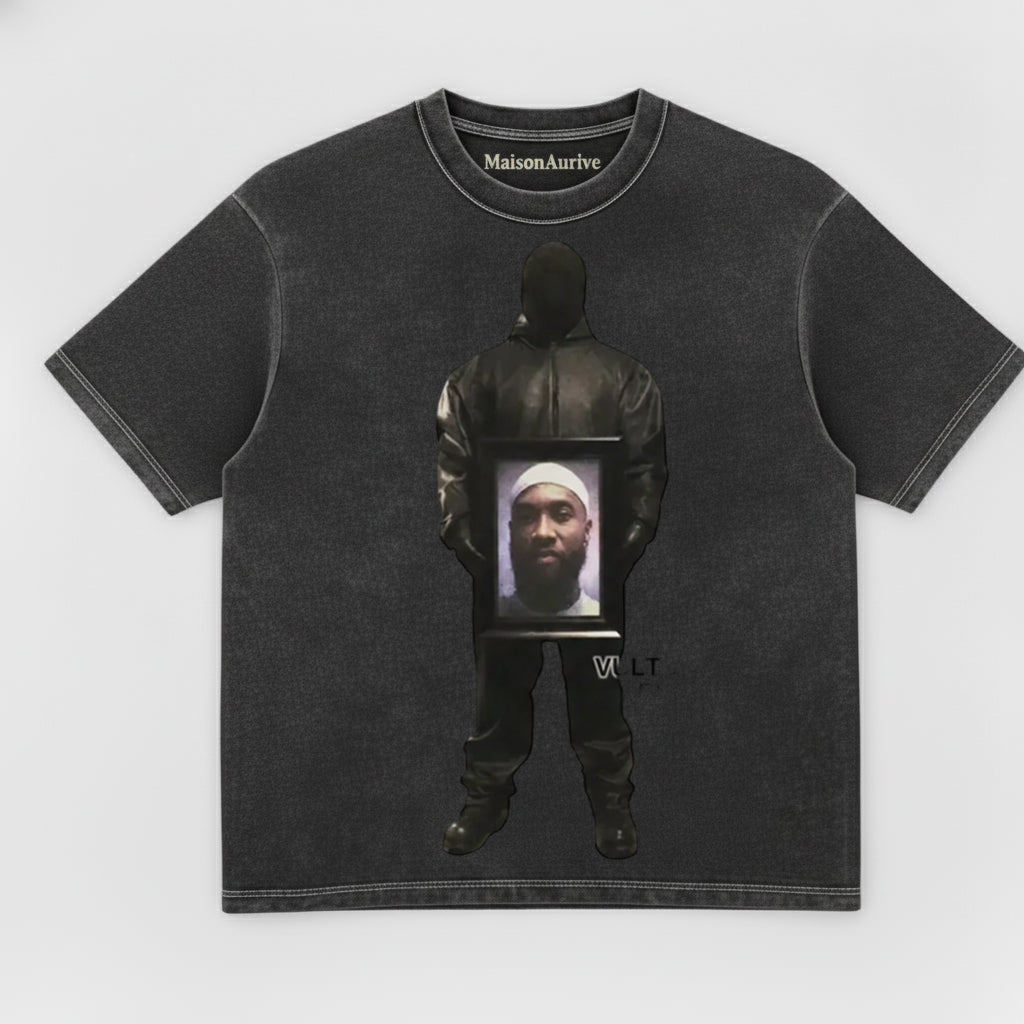 MaisonAurive वॉश्ड हिप-हॉप टी - काला | सफ़ेद | वाटरवॉश ग्रे - फर कोट पोर्ट्रेट ग्राफ़िक