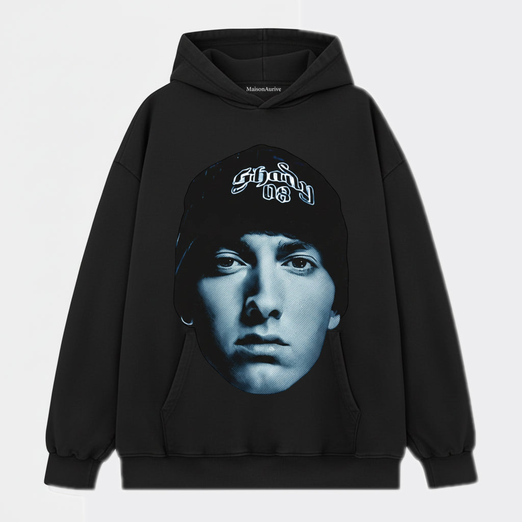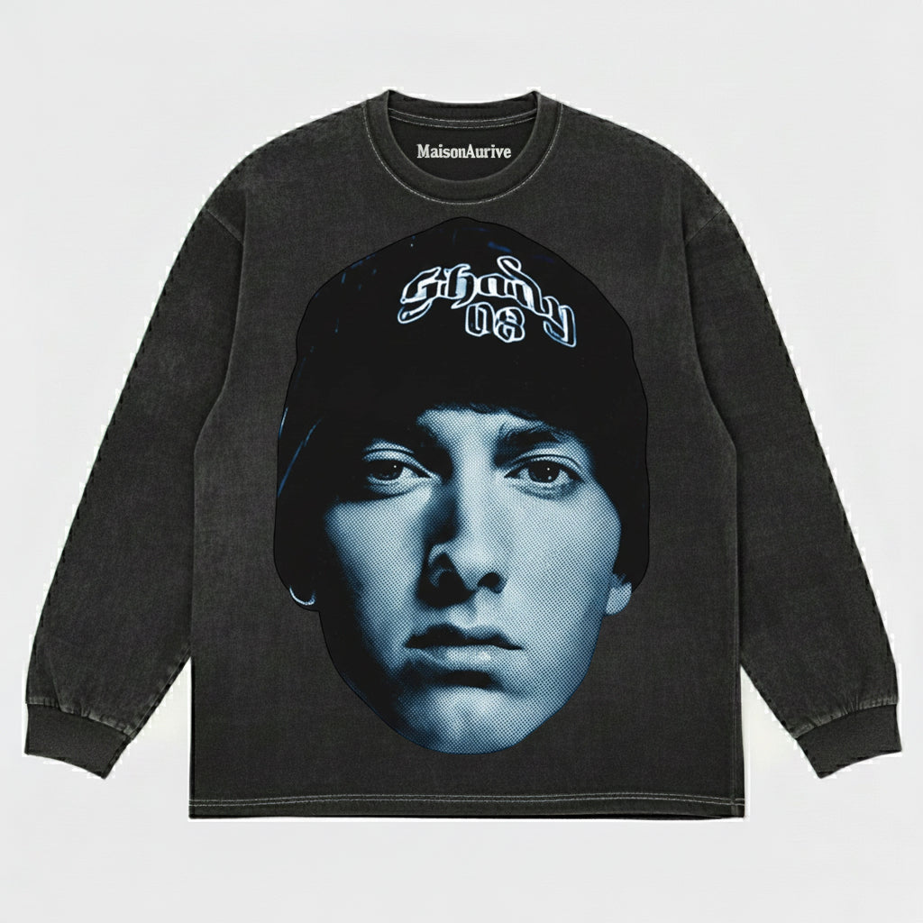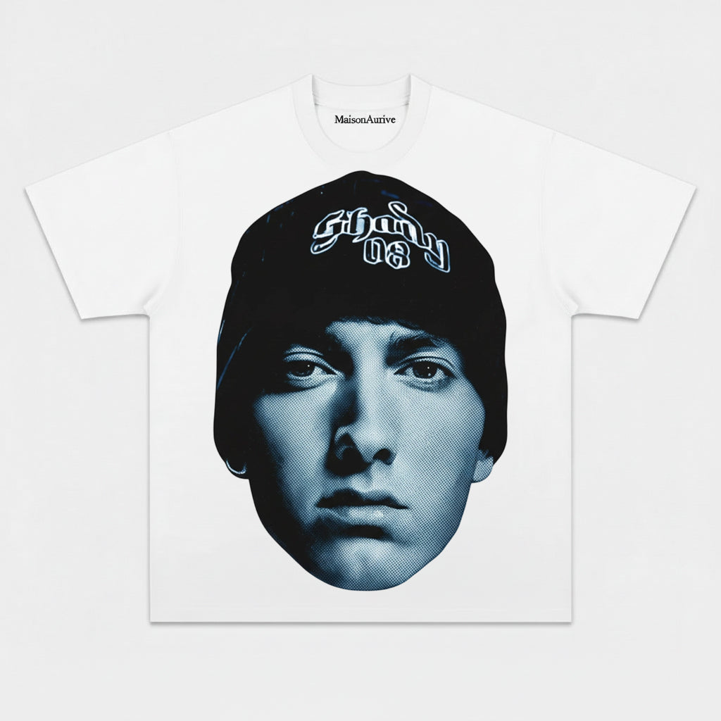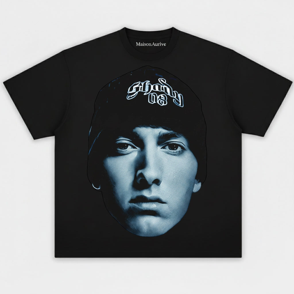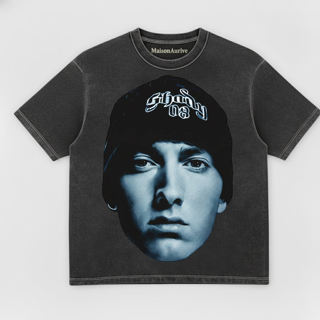 MaisonAurive ウォッシュド ブラック T シャツ – エミネム シェイディ キャップの象徴的なポートレート グラフィック