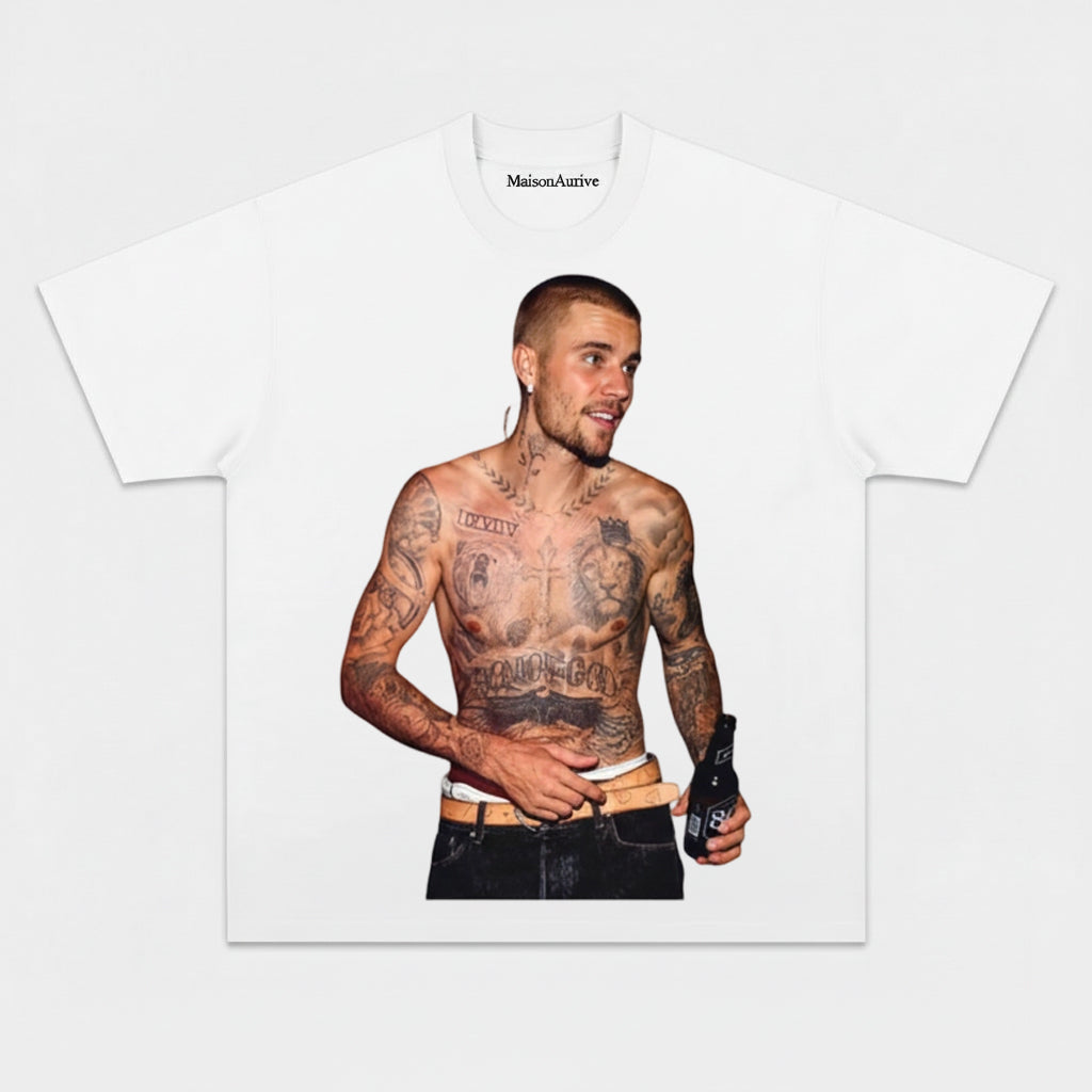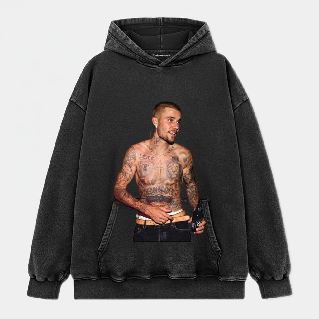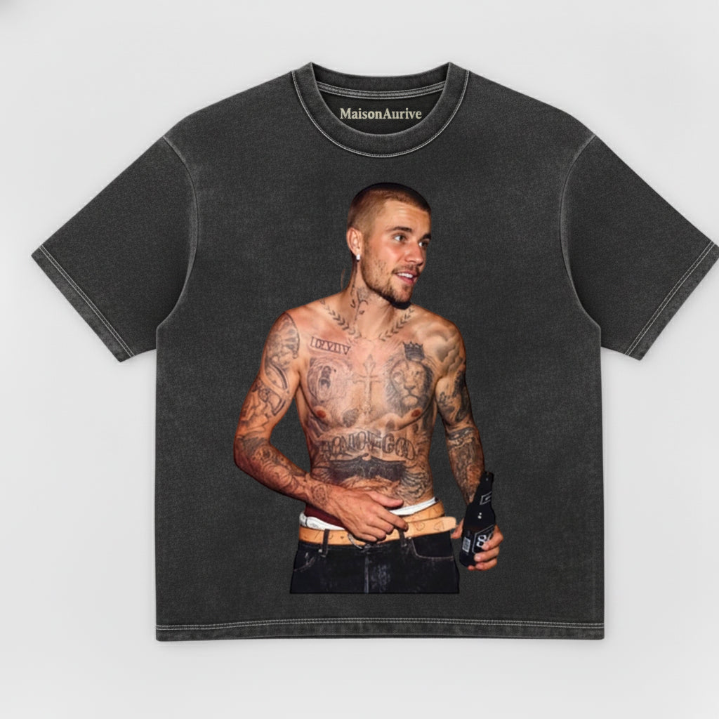 MaisonAurive ウォッシュド ブラック T シャツ – ジャスティン ビーバーのタトゥー ポートレート グラフィック
