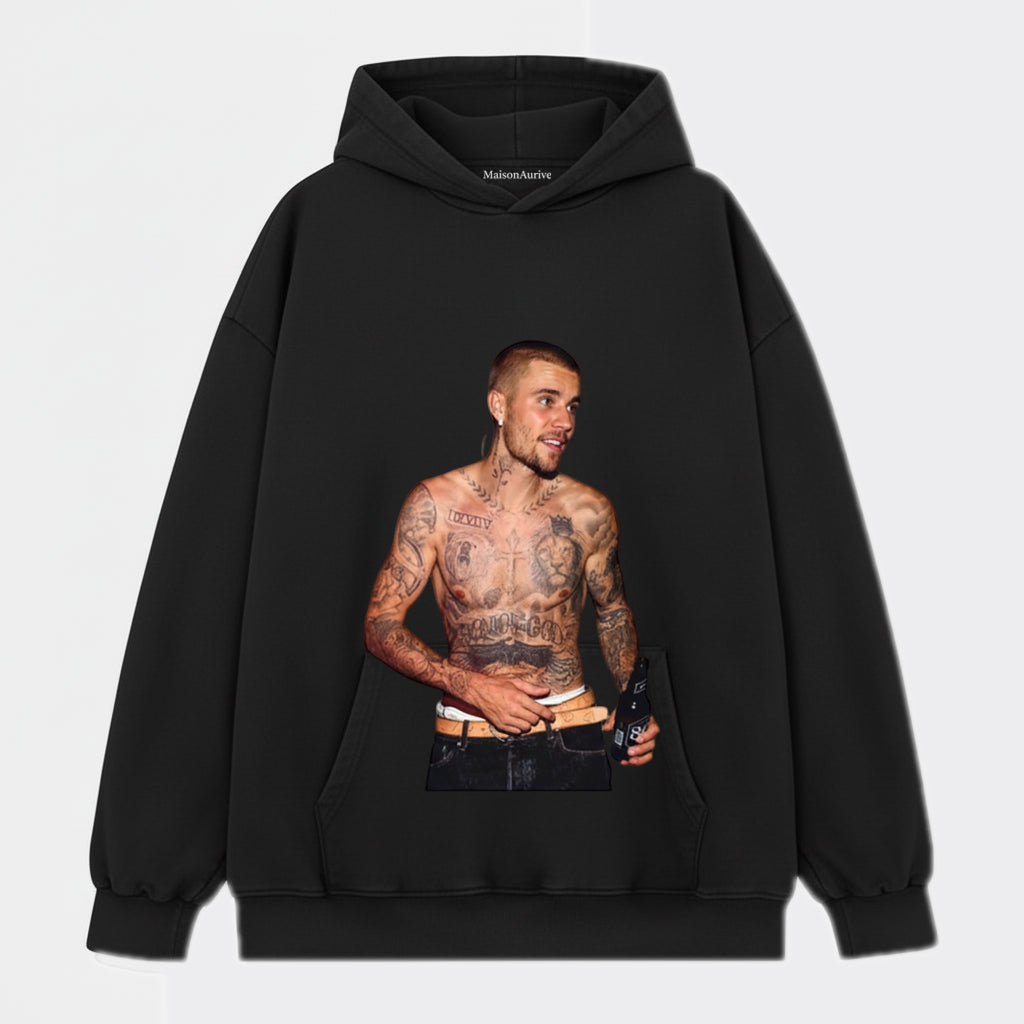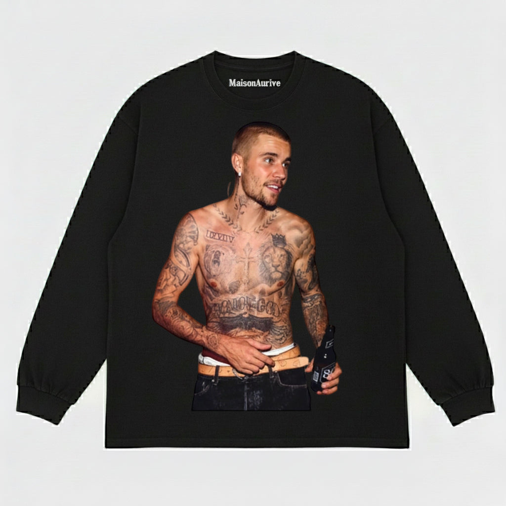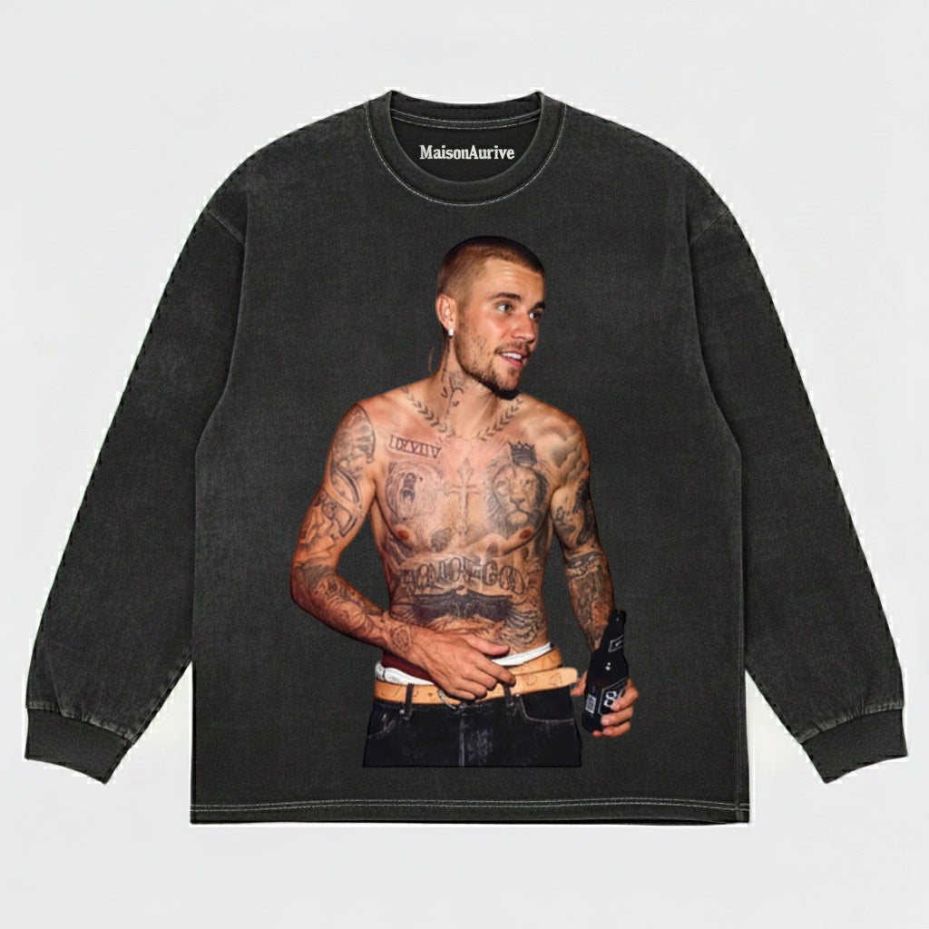 MaisonAurive ウォッシュド ブラック T シャツ – ジャスティン ビーバーのタトゥー ポートレート グラフィック