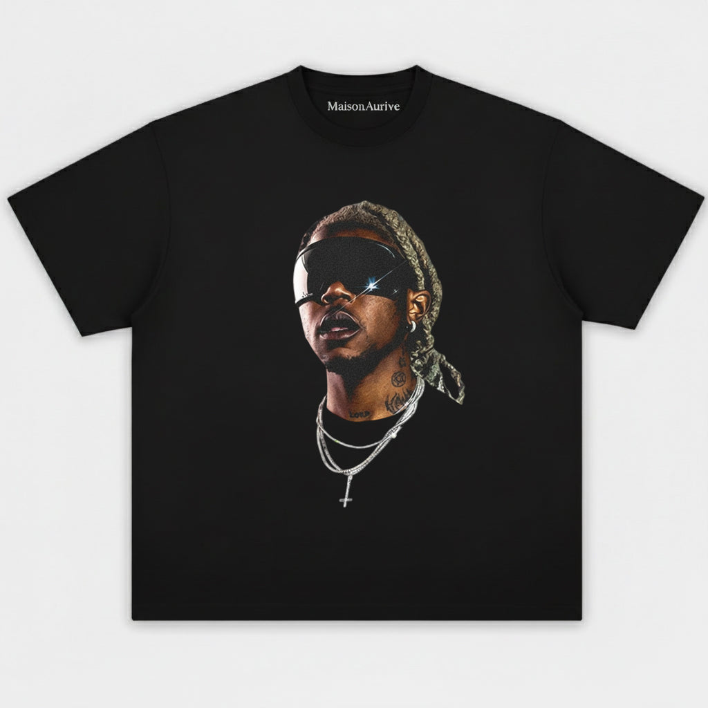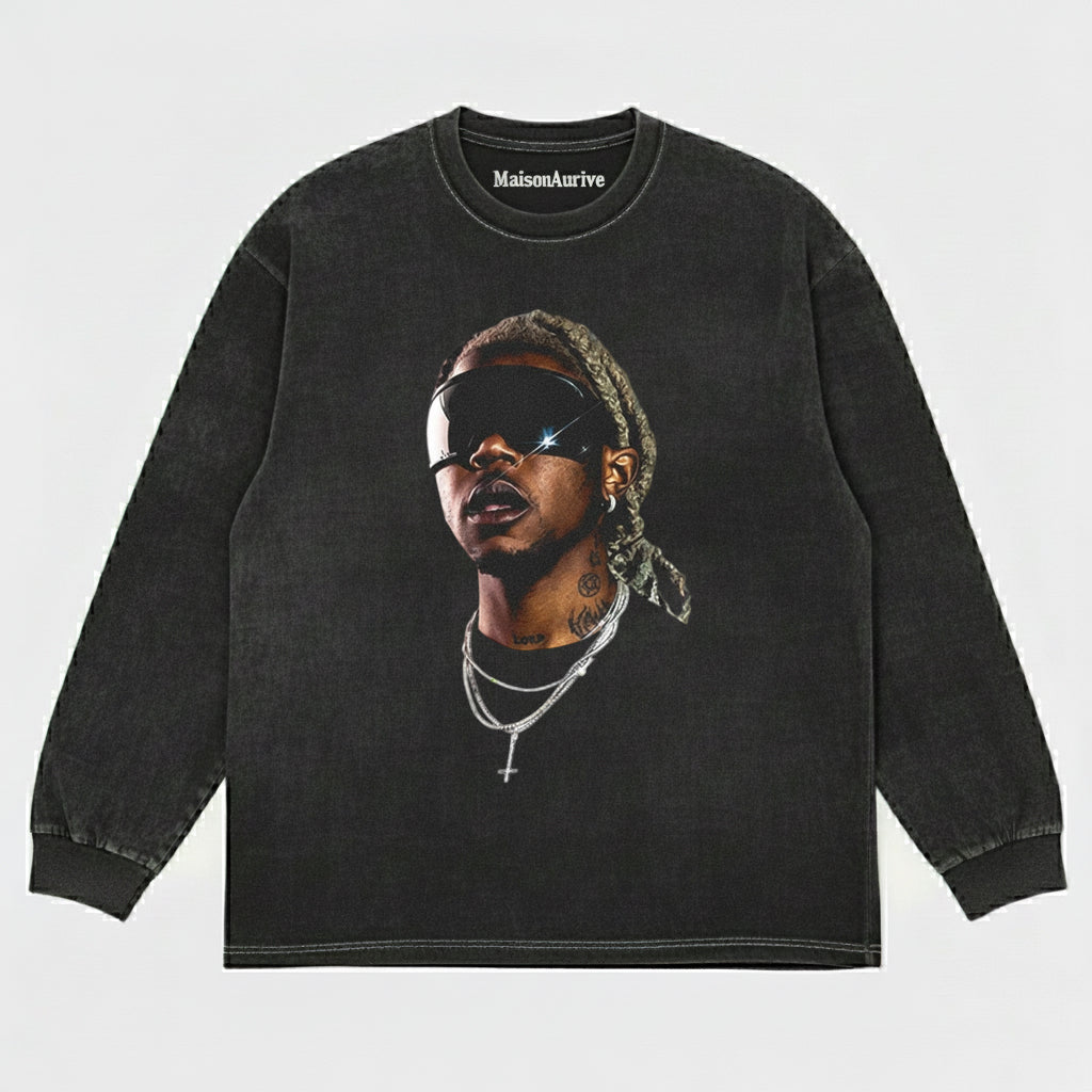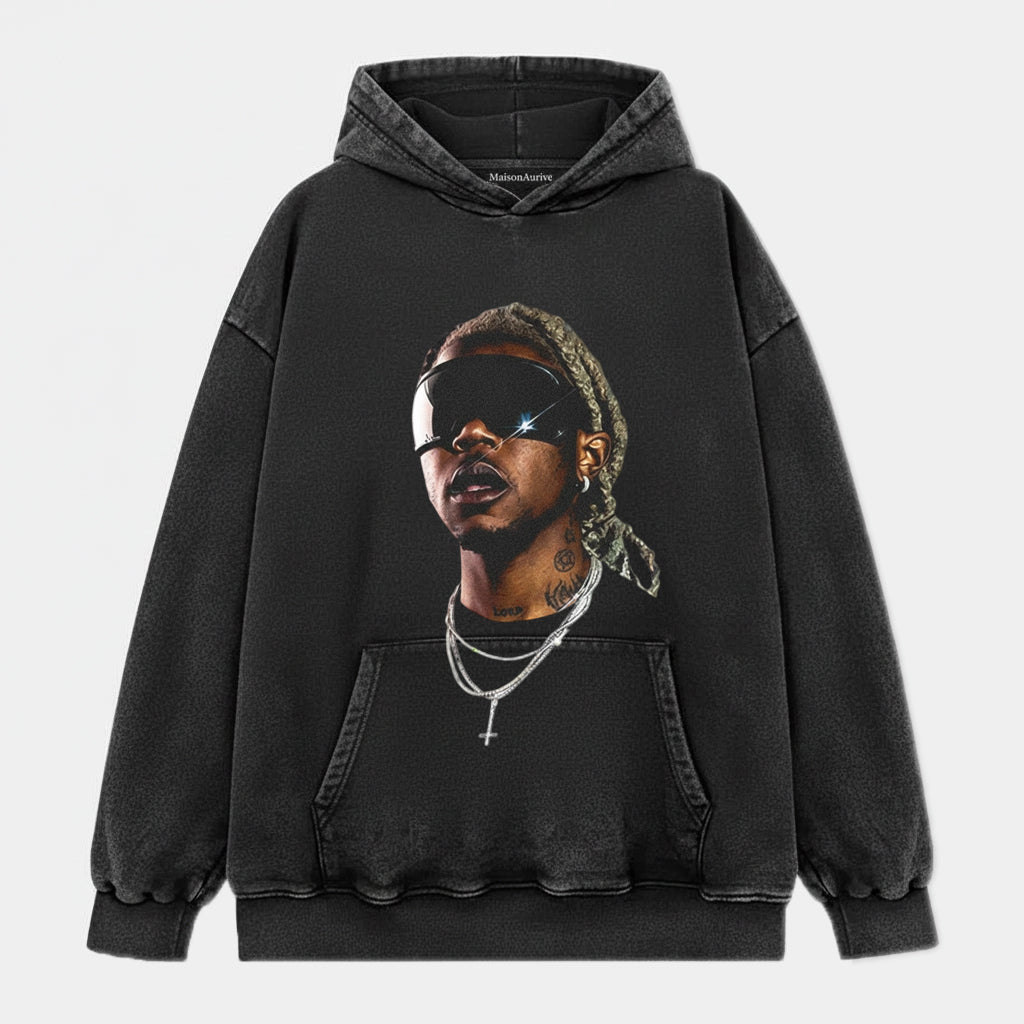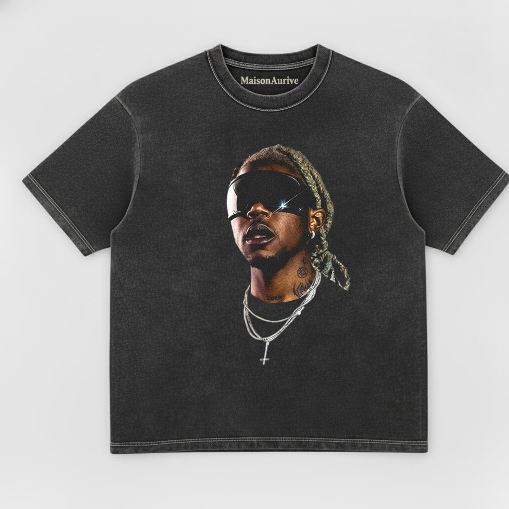 MaisonAurive ウォッシュド ヒップホップ T シャツ – 未来的な色合いのポートレート