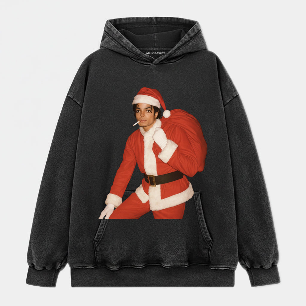 MaisonAurive ウォッシュド ヒップホップ T シャツ ブラック/ウォーターウォッシュド グレー – レトロ サンタ グラフィック ストリートウェア
