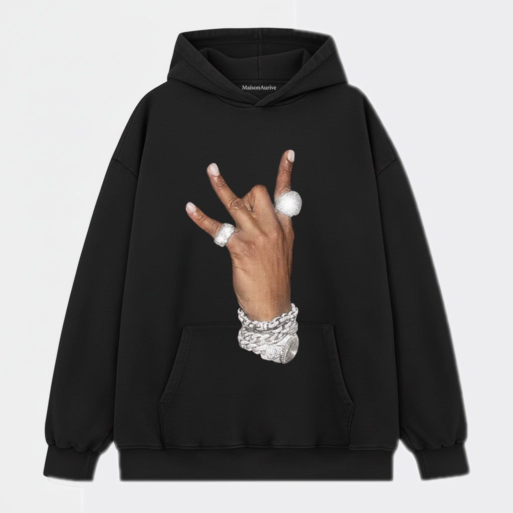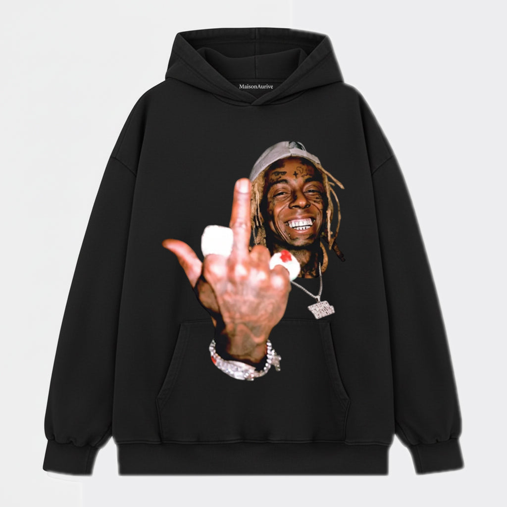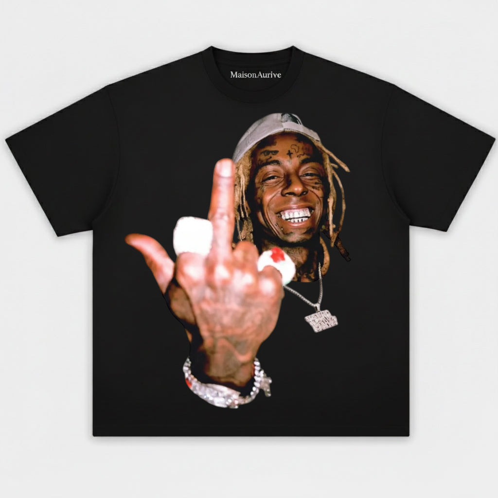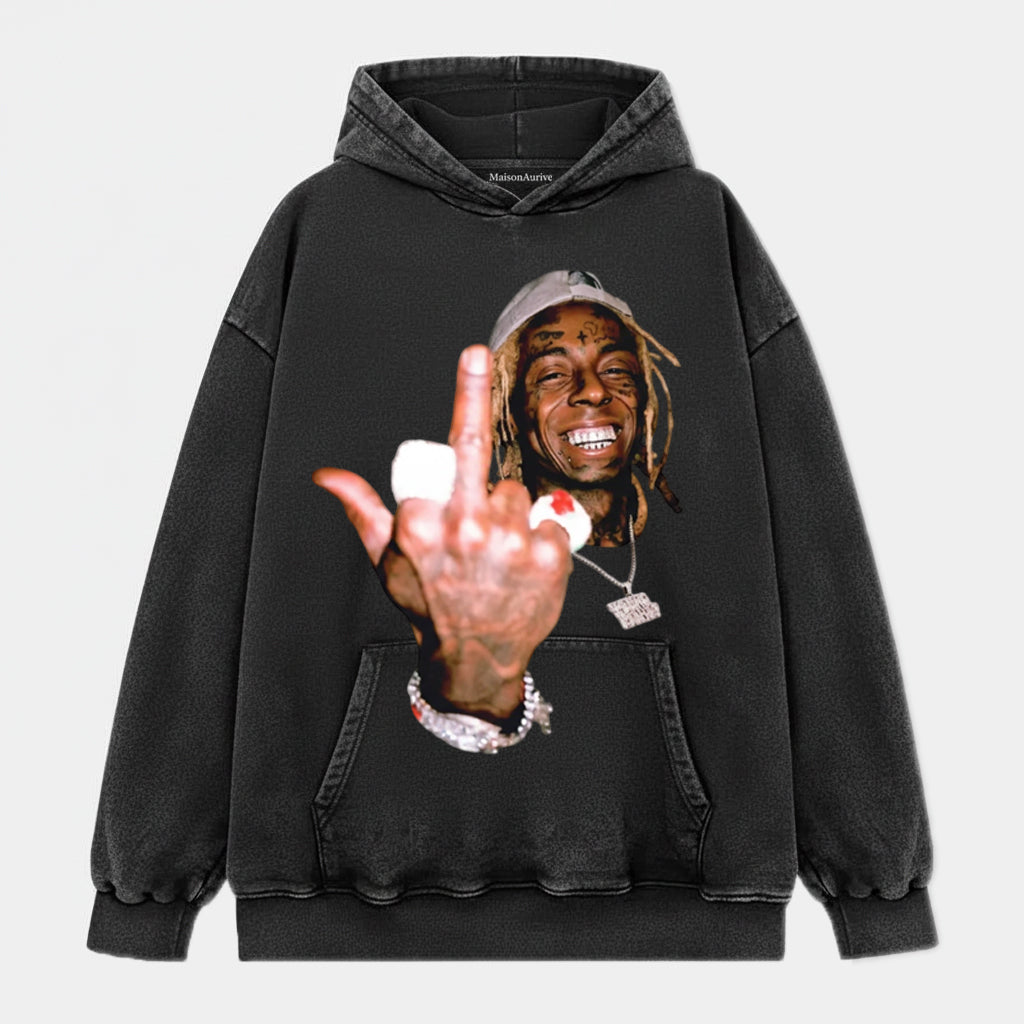 MaisonAurive ウォッシュド ブラック T シャツ – リル・ウェインの象徴的な盗品ジェスチャー グラフィック