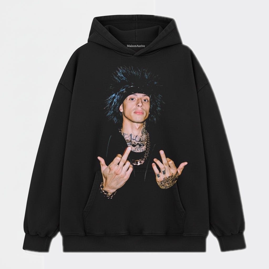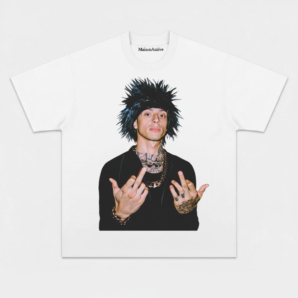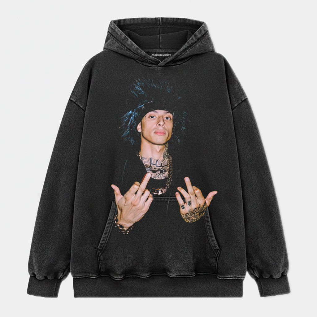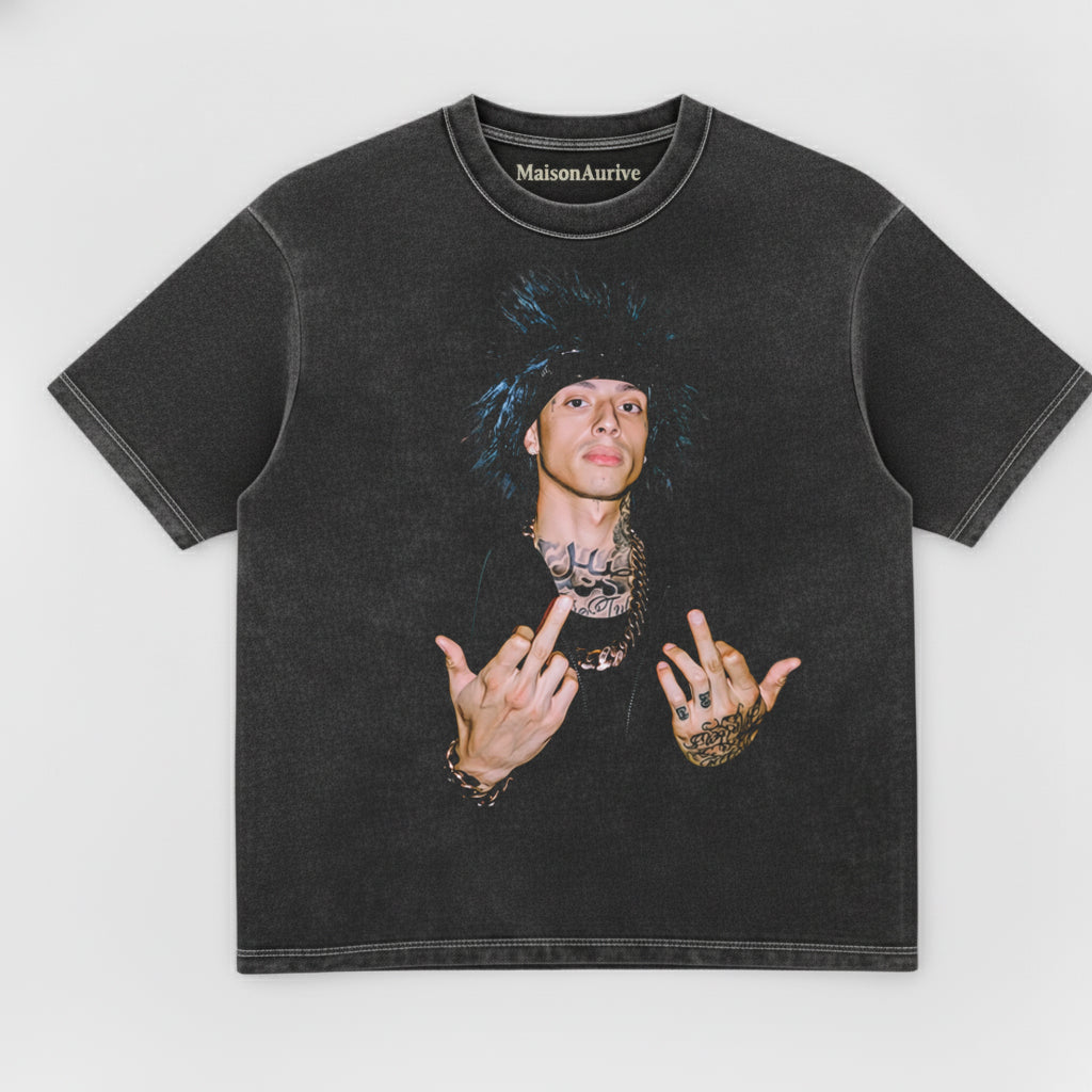 MaisonAurive 워시드 힙합 티셔츠 – 펑크 헤어 문신 제스처 포트레이트 워터워시 차콜