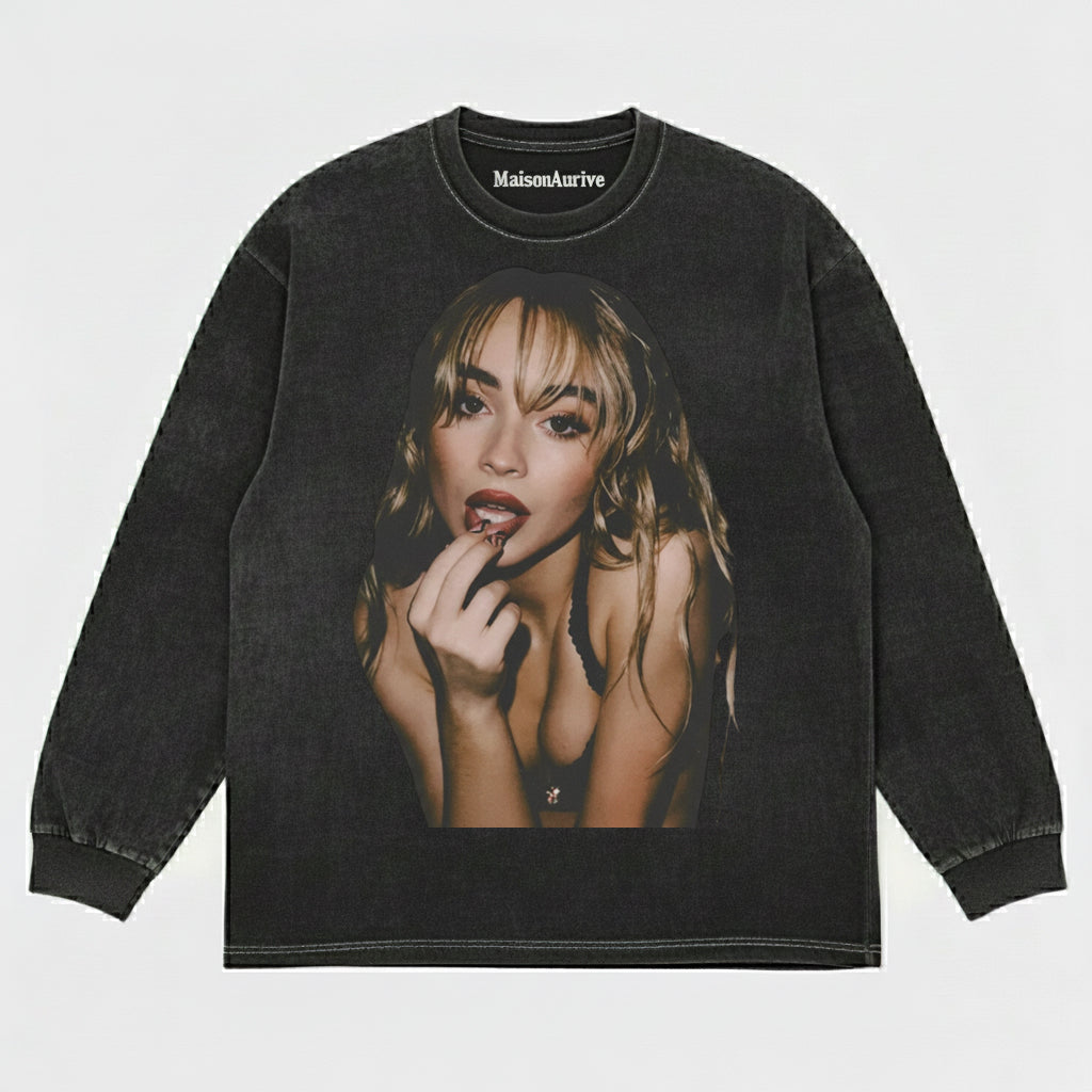 MaisonAurive Vintage gewassen houtskool T-shirt – Edgy Singer Portrait Graphic