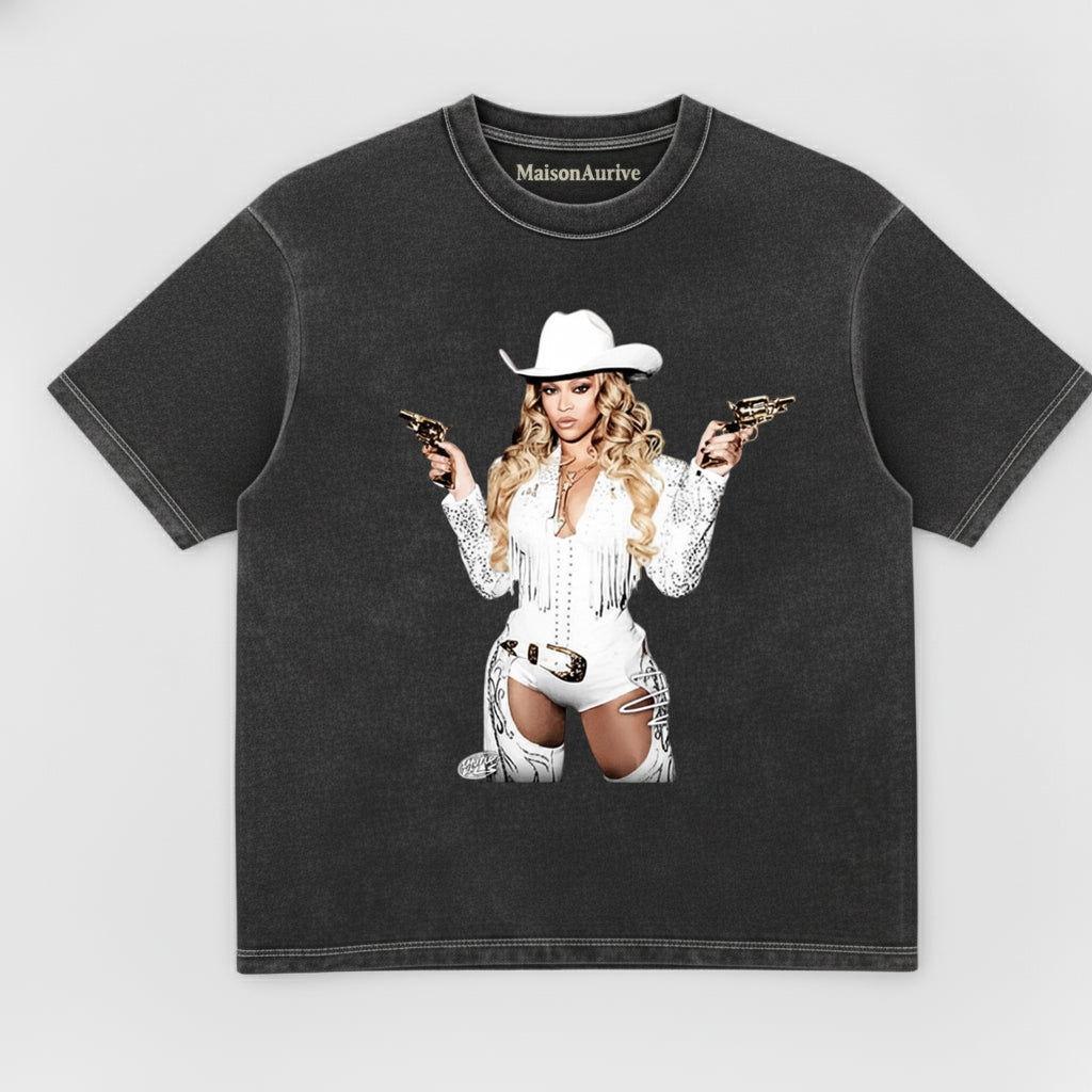 MaisonAurive 水洗西部嘻哈 T 卹 – 牛仔帽金髮肖像水洗木炭