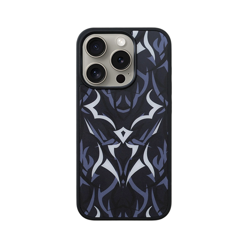採用耐用的霧面質感材料(高性能表面處理,防刮)。流暢的外型搭配醒目的深色部落/盔甲圖案(藍白對比,展現未來感)。堅固的抗衝擊結構 + 內建磁吸功能(相容於無線充電/磁性配件)-兼顧日常防護與高端未來感。